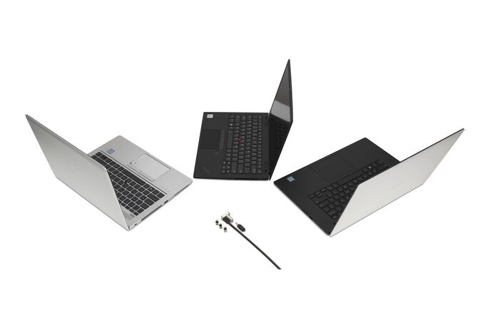 Now there’s one keyed cable lock that secures it all. The Universal 3-in-1 Keyed Laptop Lock fits any laptop security slot — standard, nano, and wedge-shaped — helping to “future-proof” your locking solution. Lock tips are easily changed; a tether keeps unused lock tips handy. Common 5mm keying system, patented Hidden Pin™ technology, and carbon steel cable provide strong security against picking and theft attempts. Pivot and rotate lock head allows flexible movement and easy key insertion. Additional features include Register & Retrieve™ for quick, secure, and easy key replacement; and a five-year warranty backed by Kensington, inventor and worldwide leader in laptop security locks. All Kensington locks are verified and tested for strength, physical endurance, and mechanical resilience.